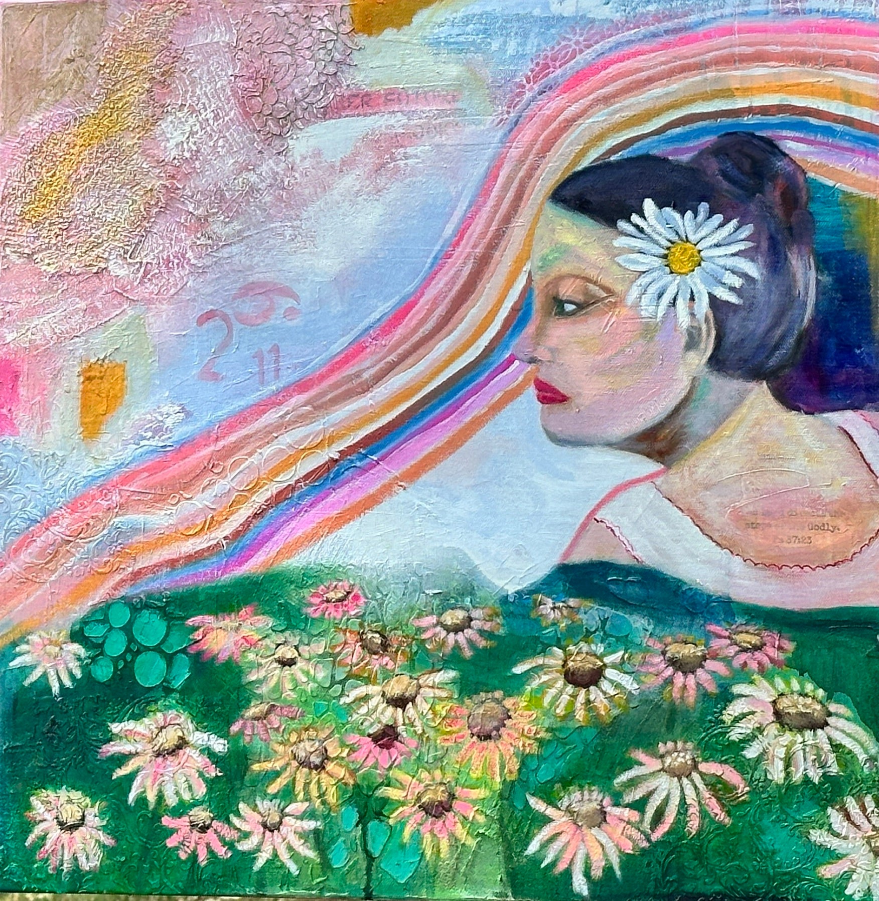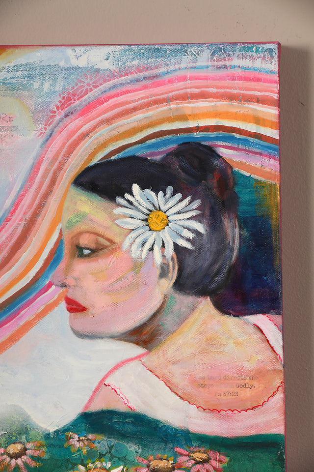 This Lady is my Mother. Her name was Betty Jane and she went by Bjay. In the photo that inspired this piece, she is about 16 years old and is gazing pensively across a lake. I can just imagine her thoughts as she contemplated her future. Her past was rough and full of trauma but she was always an optimistic person, so I imaging she was thinking her future would be better than her past.