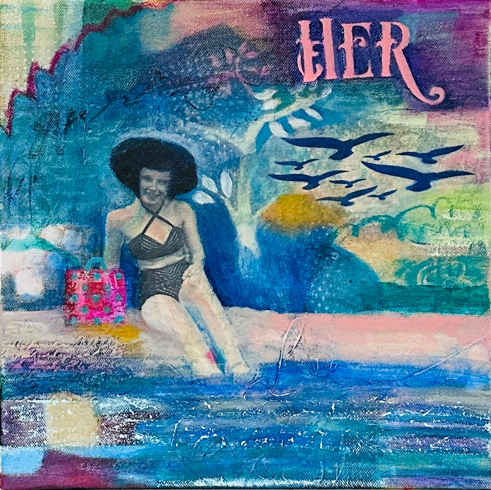 This piece evolved as most of my work does. I was really struggling trying to take it one direction and it just wasn't working. Then, I'm sure it was divine inspiration, I remembered the photo of my Mom on her honeymoon. I printed it and incorporated it into the piece and I love the way it turned out. I hope you do too! She could hang in anyone's home.