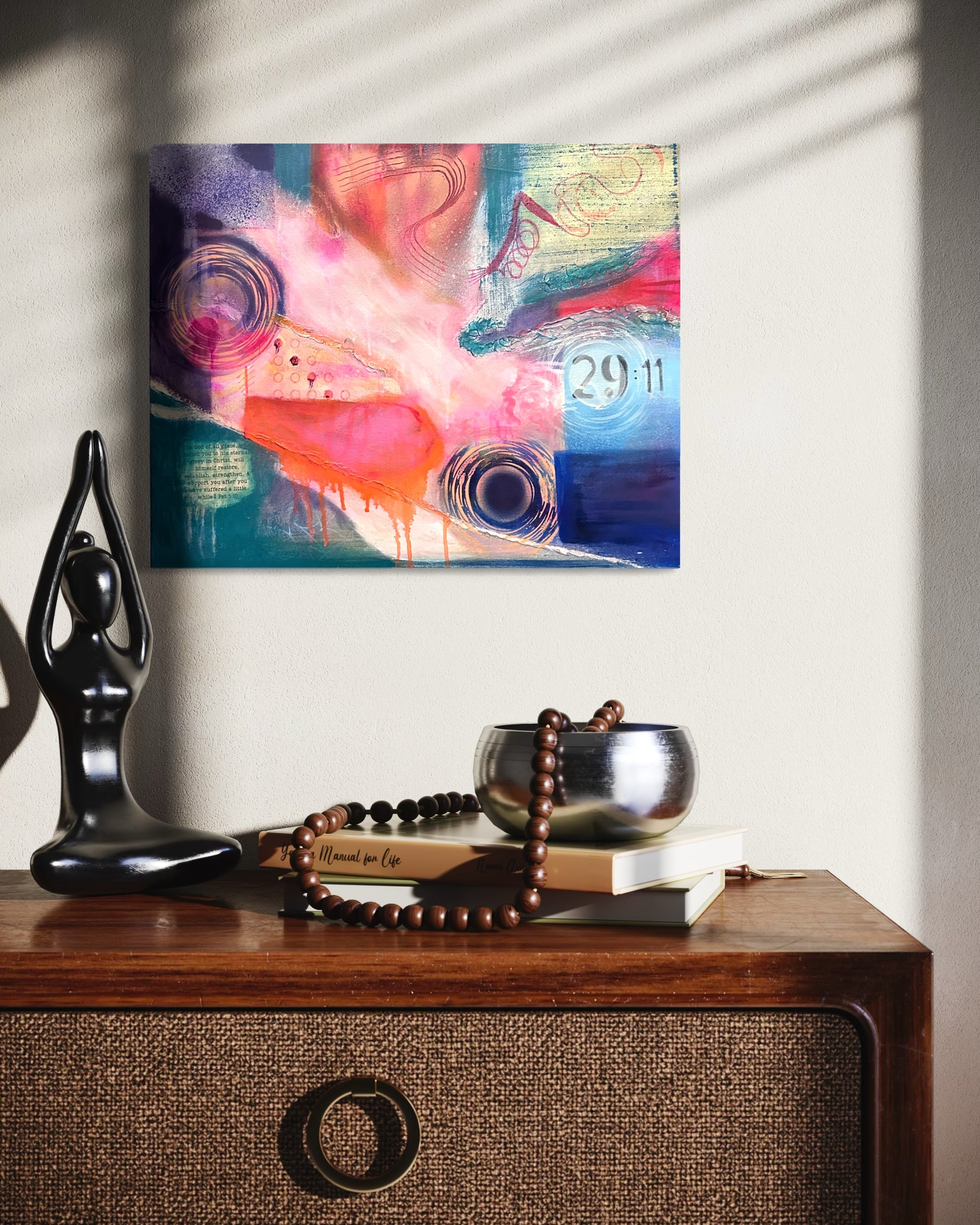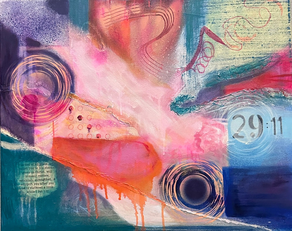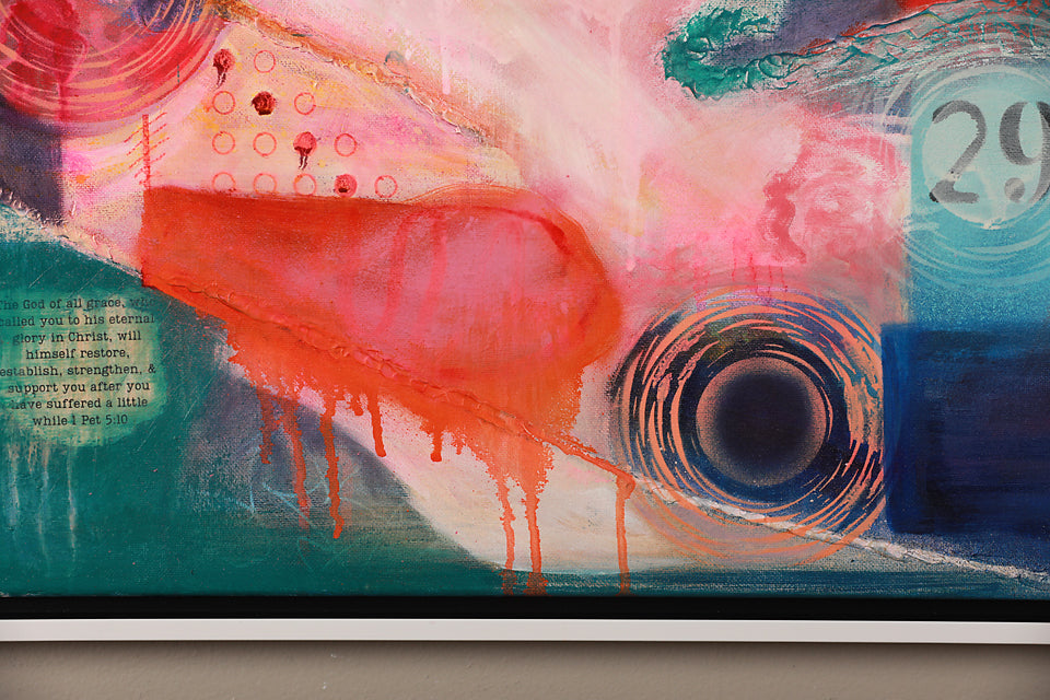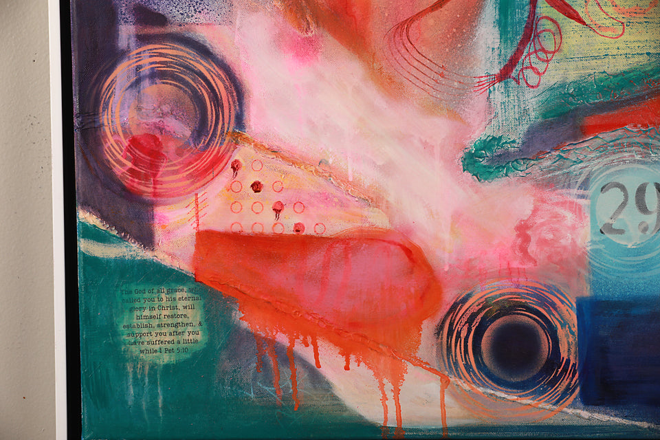 This painting was a complete experiment as I explored different mediums and shapes. 1Peter 5:10 was the inspiration. “The God of all grace, who called you to his eternal glory in Christ, will himself restore, establish, strengthen and support you after you have suffered a little while.